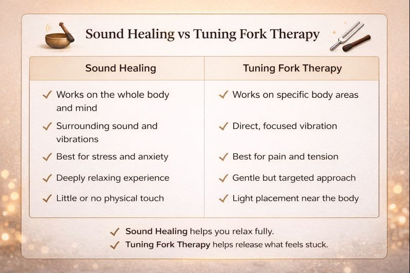 Neither is better for everyone. Sound healing suits general stress and mental fatigue, while tuning fork therapy works better for specific pain or tension.